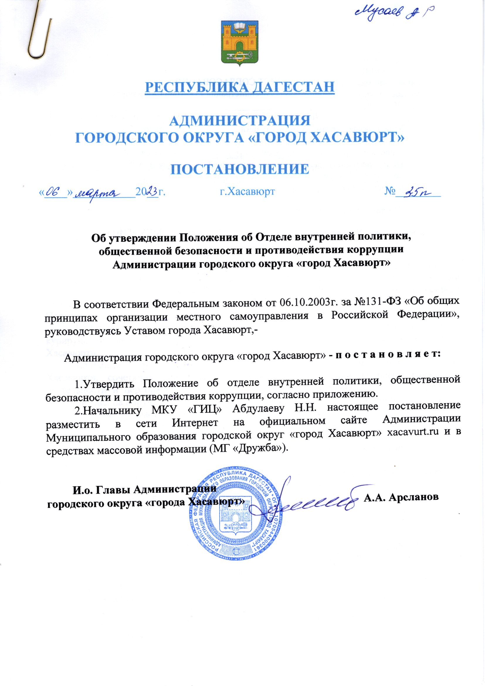 Постановление № 35п от 06 марта 2023 г. Об утверждении Положения об Отделе внутренней политики, общественной безопасности и противодействия коррупции Администрации городского округа "город Хасавюрт"