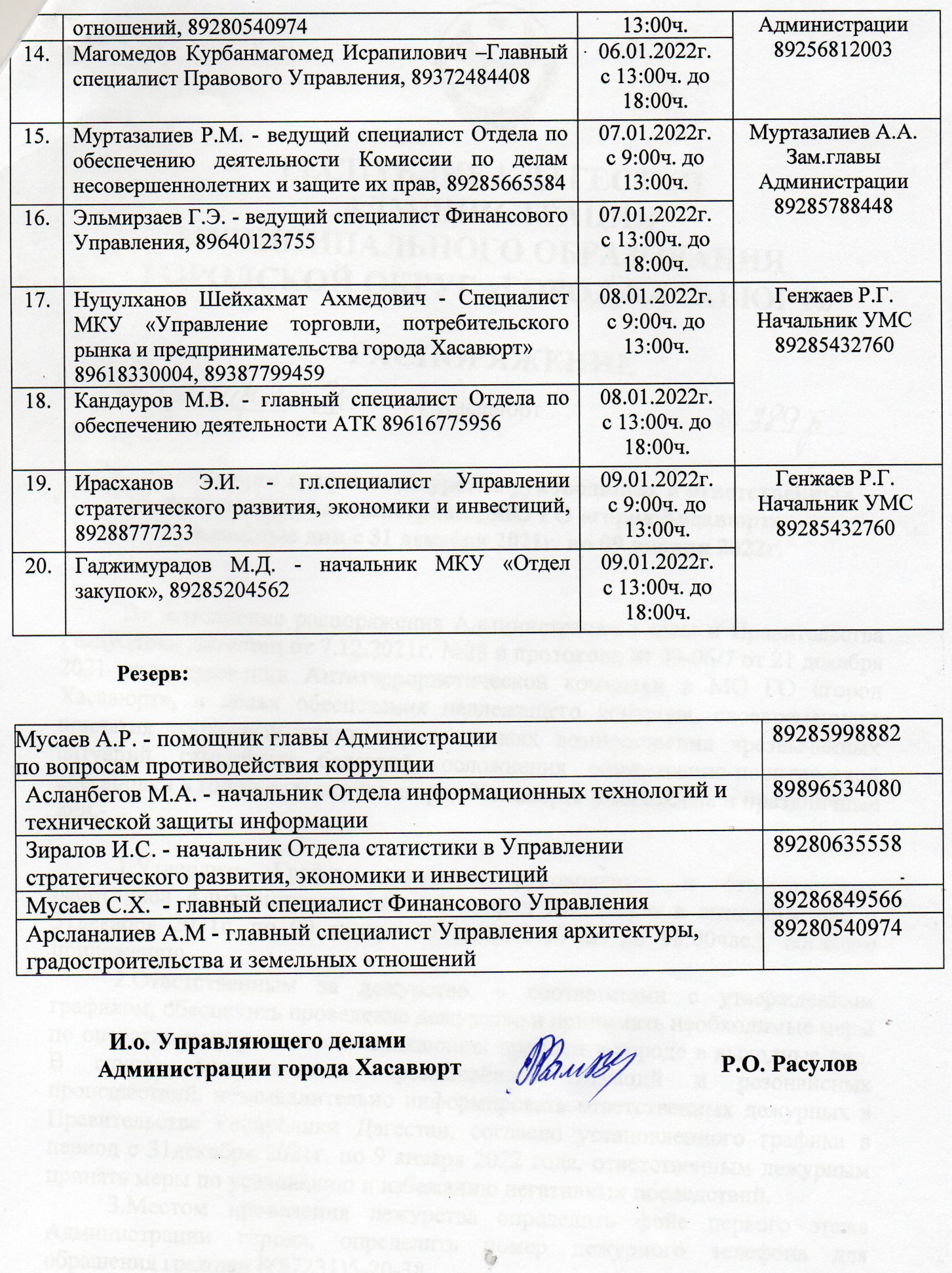 Распоряжение №789р от 22 декабря 2021г об утверждении графика дежурства руководящих и ответственных работников Администрации МО ГО "город Хасавюрт" в выходные дни с 01 по 09 января 2022г.