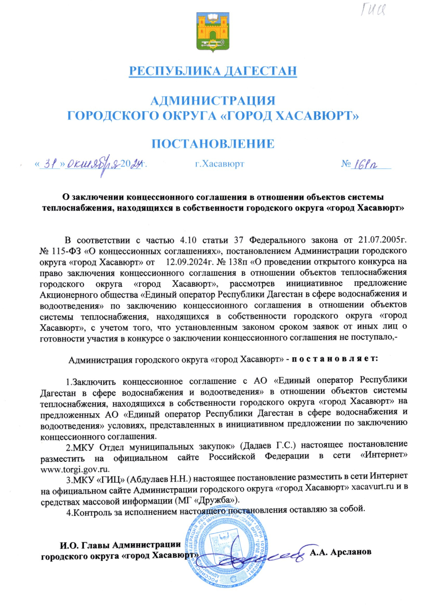Постановление от 31 октября 2024 г. № 161п О заключении концессионного соглашения в отношении объектов системы теплоснабжения, находящихся в собственности городского округа «город Хасавюрт»