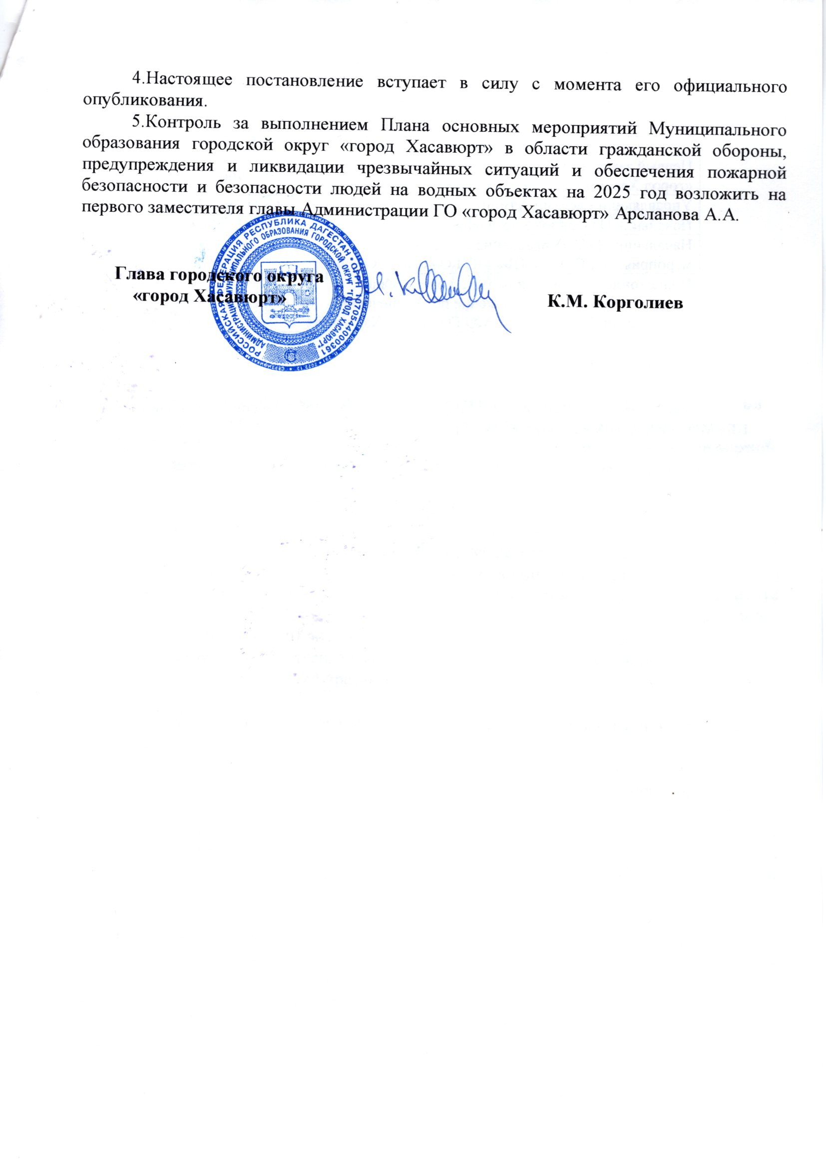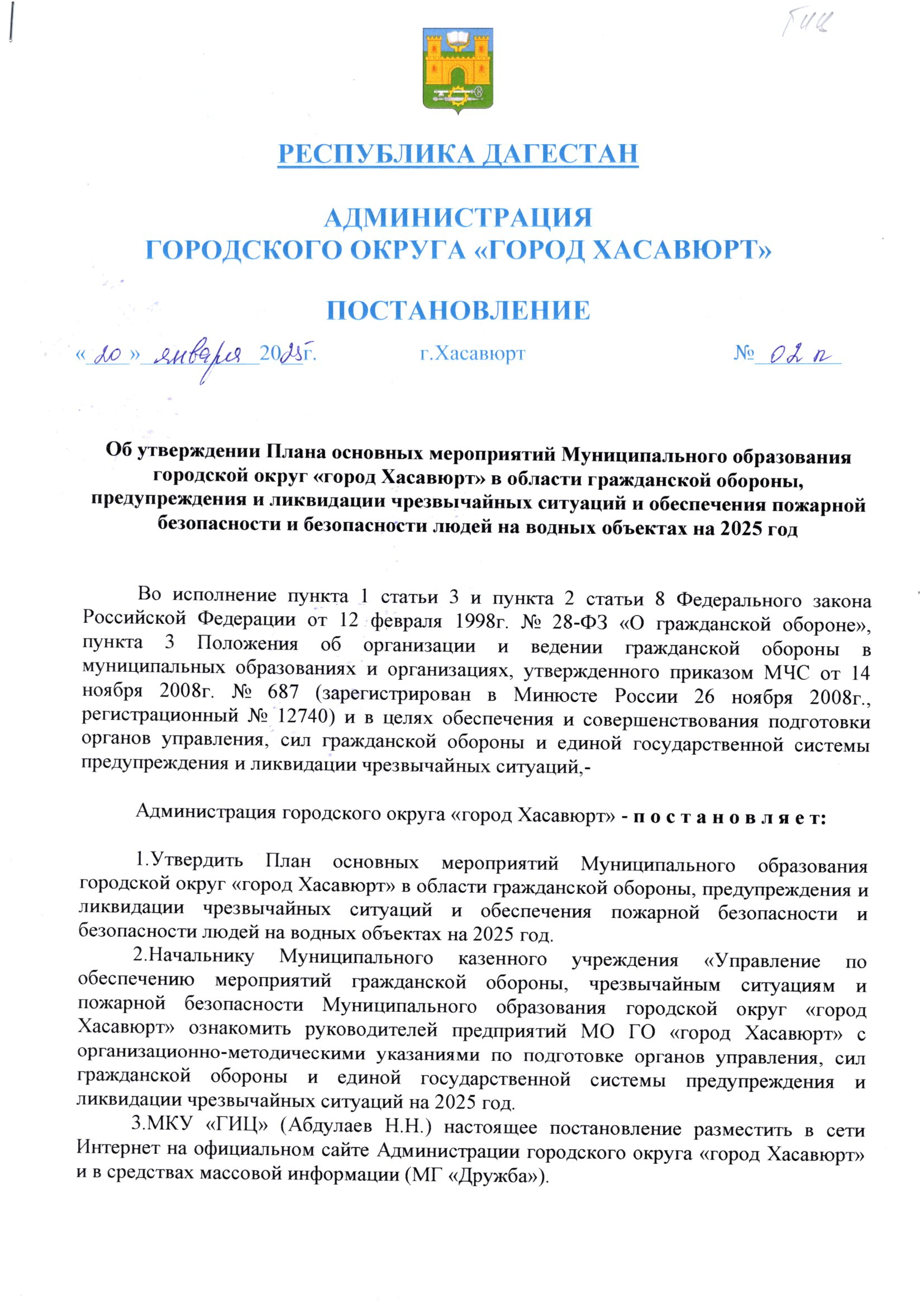 Постановление от 20 января 2025 г. № 02п Об утверждении Плана основных мероприятий Муниципального образования городской округ «город Хасавюрт» в области гражданской обороны, предупреждения и ликвидации чрезвычайных ситуаций и обеспечения пожарной безопасности и безопасности людей на водных объектах на 2025 год