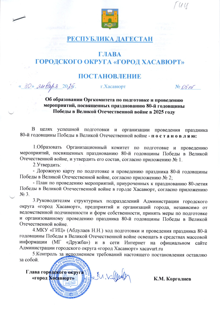 Постановление от 30 января 2025 г. № 05 пг Об образовании Оргкомитета по подготовке и проведению мероприятий, посвященных празднованию 80-й годовщины Победы в Великой Отечественной войне в 2025 году