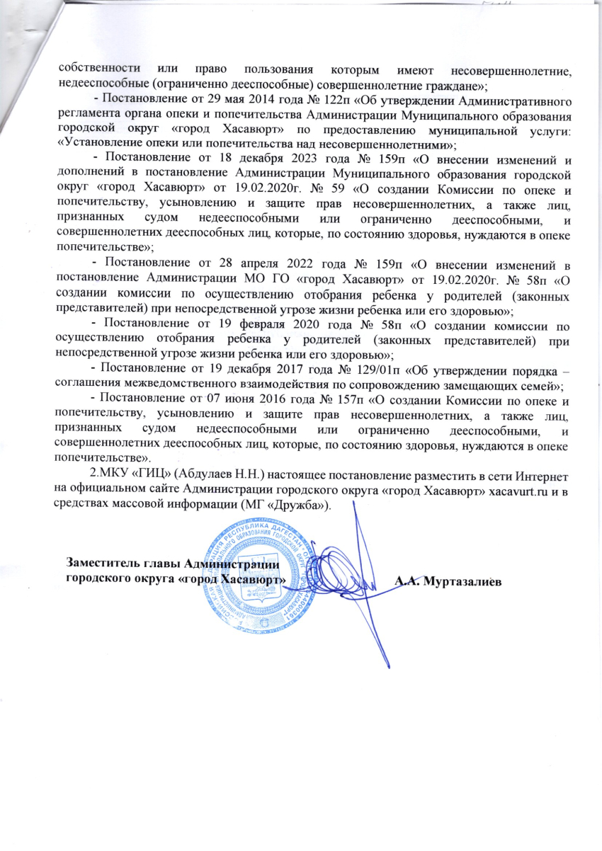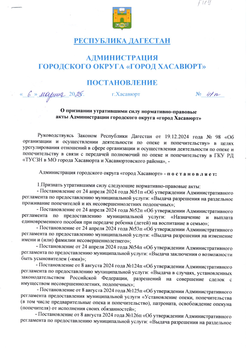 Постановление от 6 марта 2025 г. № 41п О признании утратившими силу нормативно-правовые акты Администрации городского округа «город Хасавюрт»
