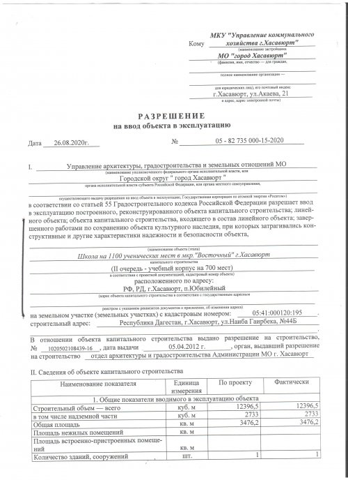 Разрешение на ввод объекта в эксплуатацию №05-82 735 000-15-2020