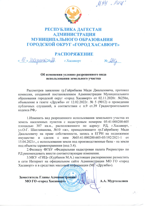 Распоряжение №286р от 16 марта 2022 г. Об изменении условно разрешенного вида использования земельного участка