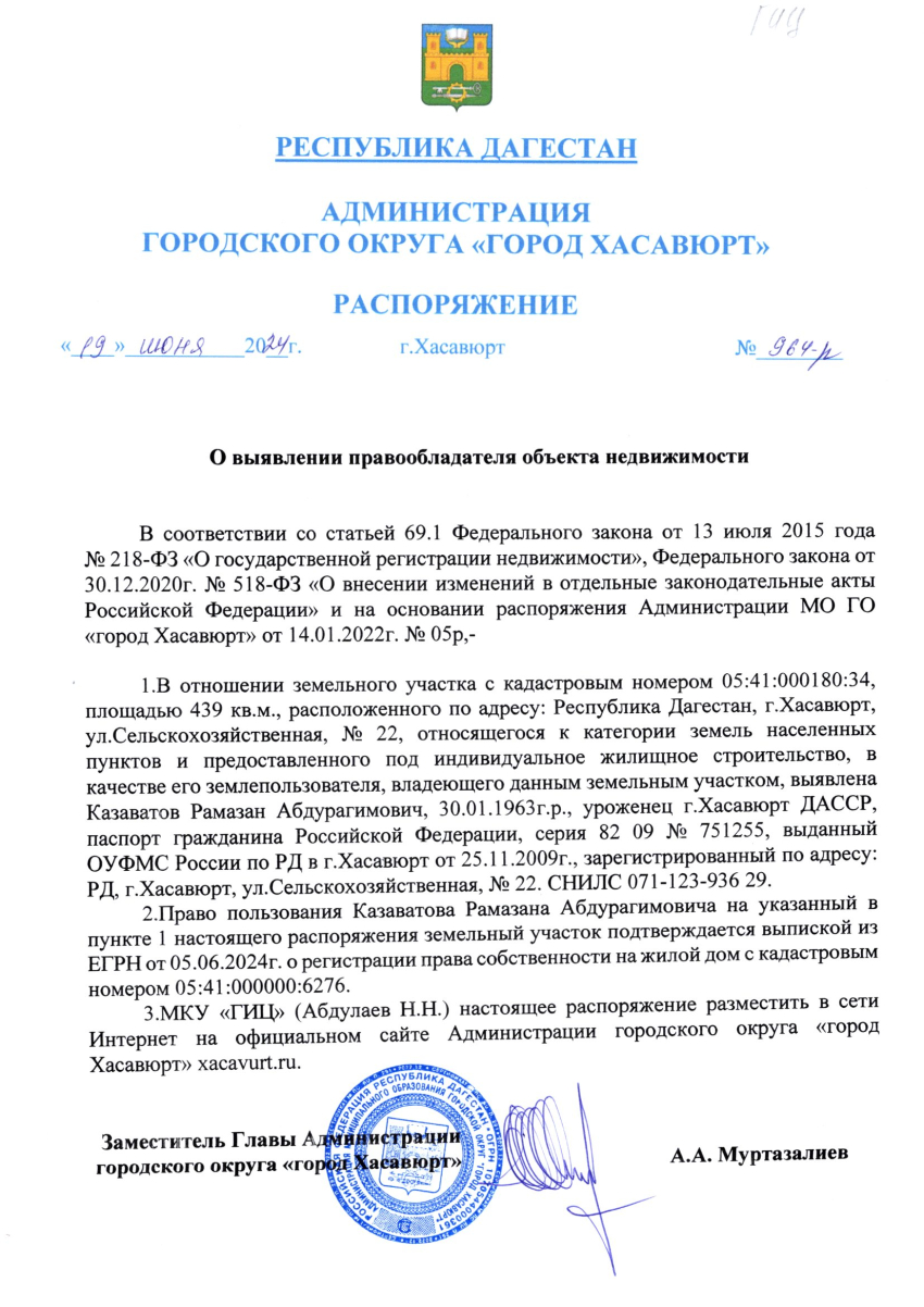 Распоряжение от 19 июня 2024 г. № 964-р О выявлении правообладателя объекта недвижимости