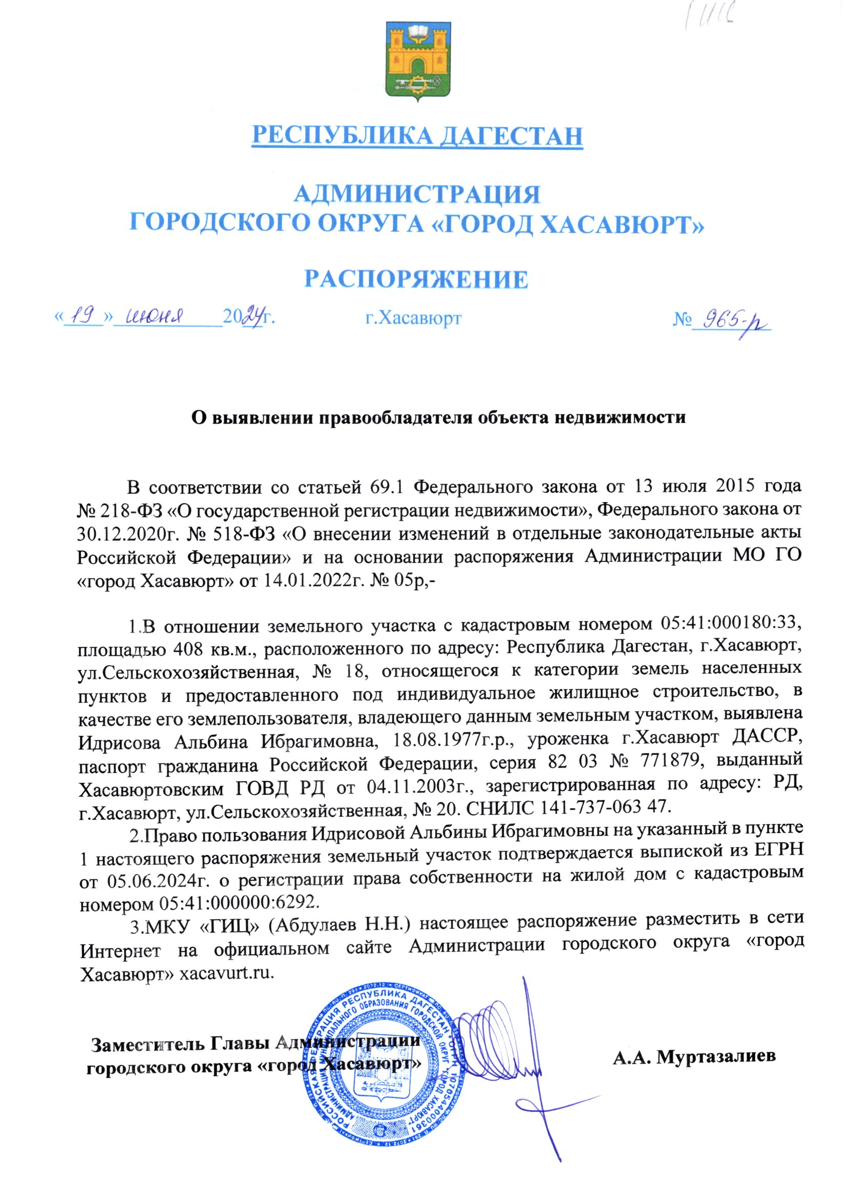 Распоряжение от 19 июня 2024 г. № 965-р О выявлении правообладателя объекта недвижимости
