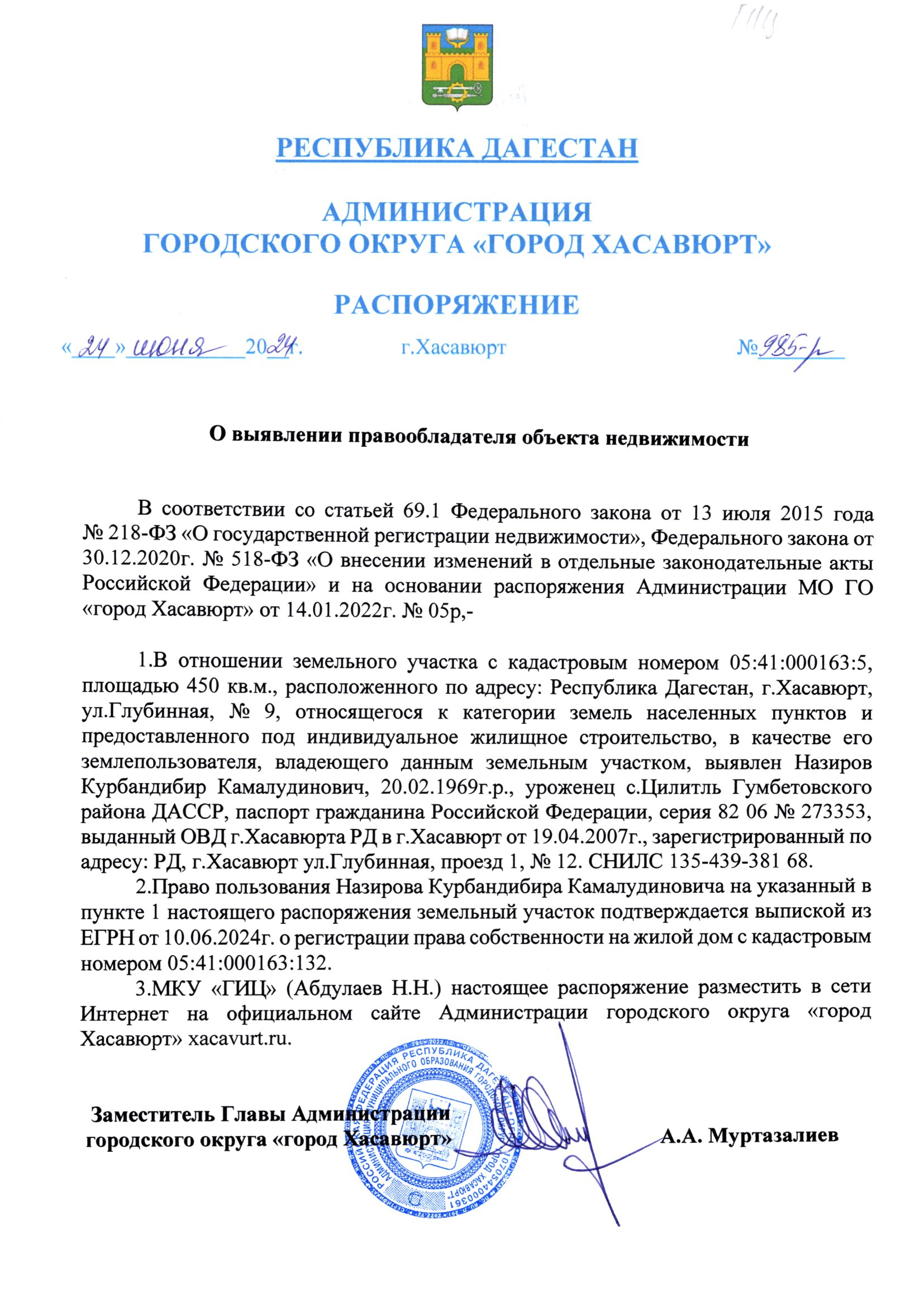 Распоряжение от 24 июня 2024 г. № 985-р О выявлении правообладателя объекта недвижимости