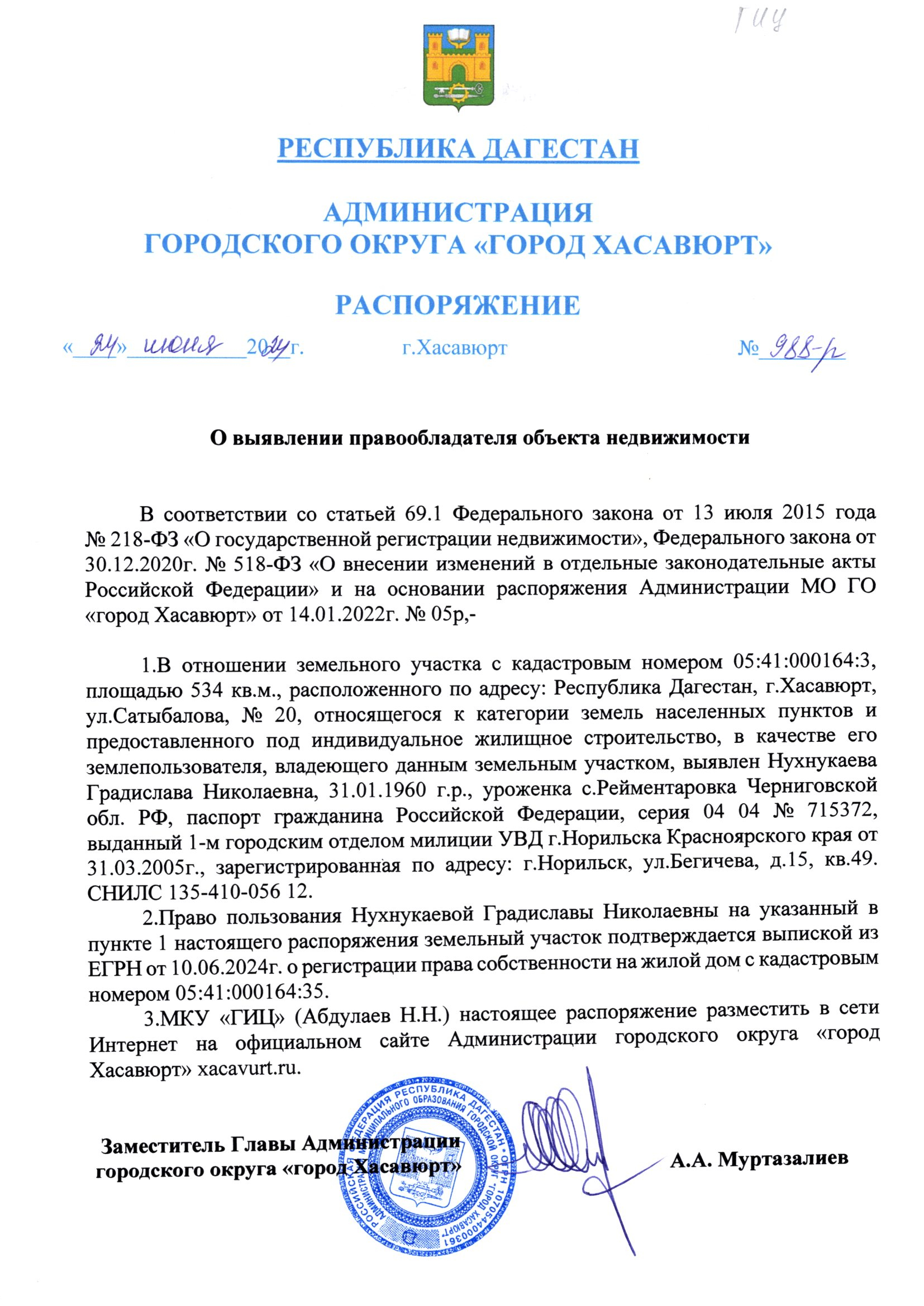 Распоряжение от 24 июня 2024 г. № 988-р О выявлении правообладателя объекта недвижимости
