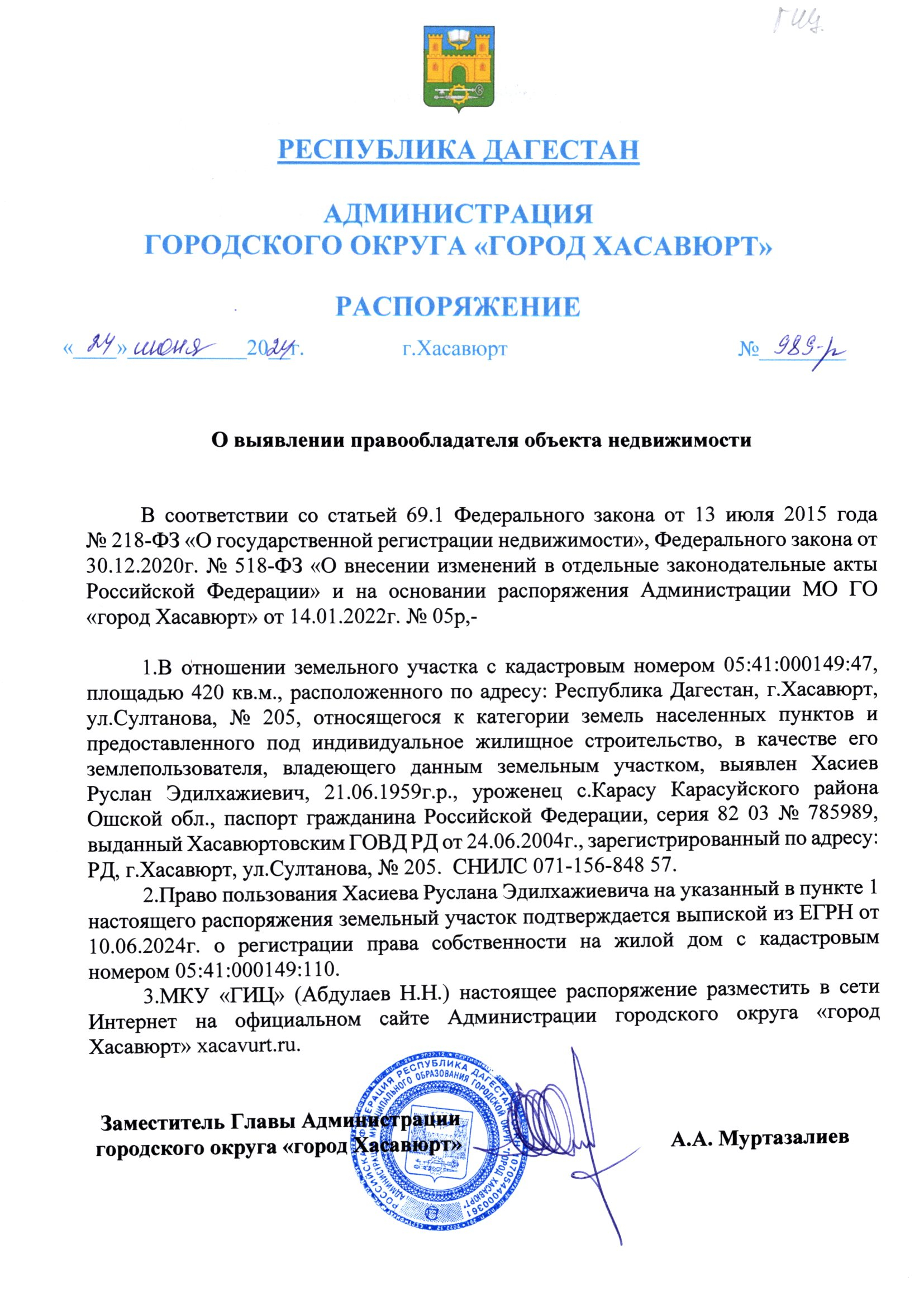 Распоряжение от 24 июня 2024 г. № 989-р О выявлении правообладателя объекта недвижимости