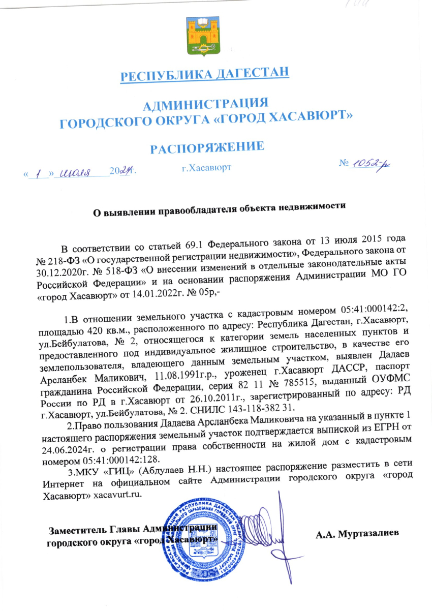 Распоряжение от 01 июля 2024 г. № 1052-р О выявлении правообладателя объекта недвижимости