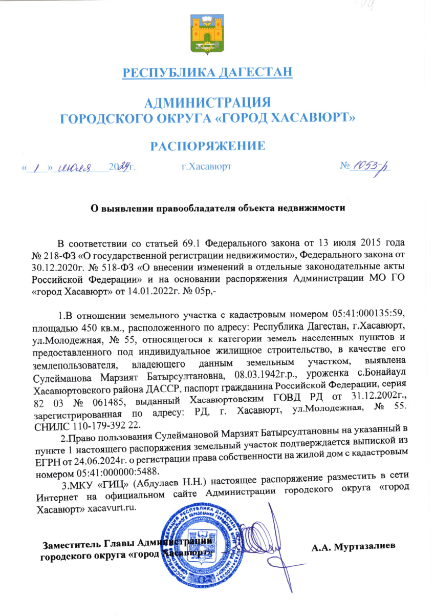 Распоряжение от 01 июля 2024 г. № 1053-р О выявлении правообладателя объекта недвижимости