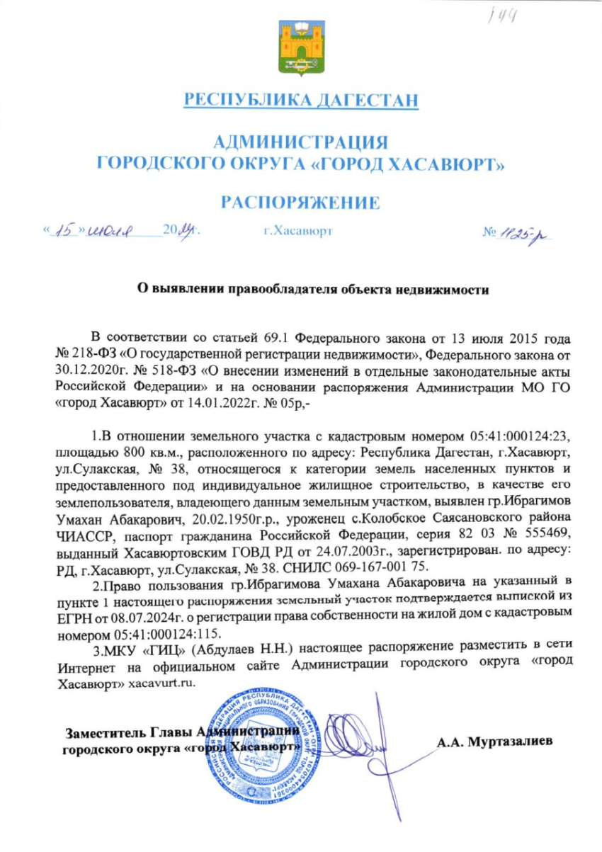 Распоряжение от 15 июля 2024 г. № 1125-р О выявлении правообладателя объекта недвижимости