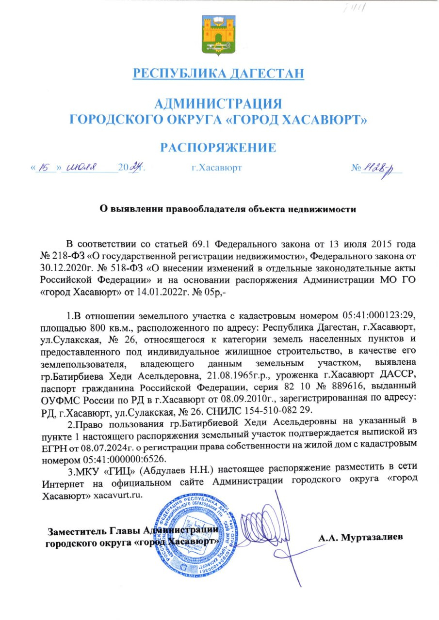 Распоряжение от 15 июля 2024 г. № 1128-р О выявлении правообладателя объекта недвижимости