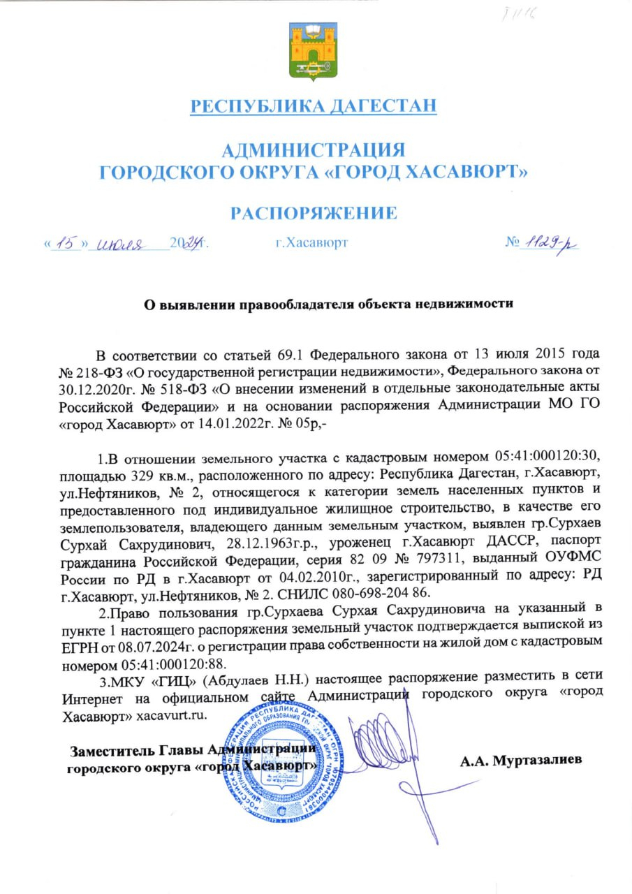 Распоряжение от 15 июля 2024 г. № 1129-р О выявлении правообладателя объекта недвижимости