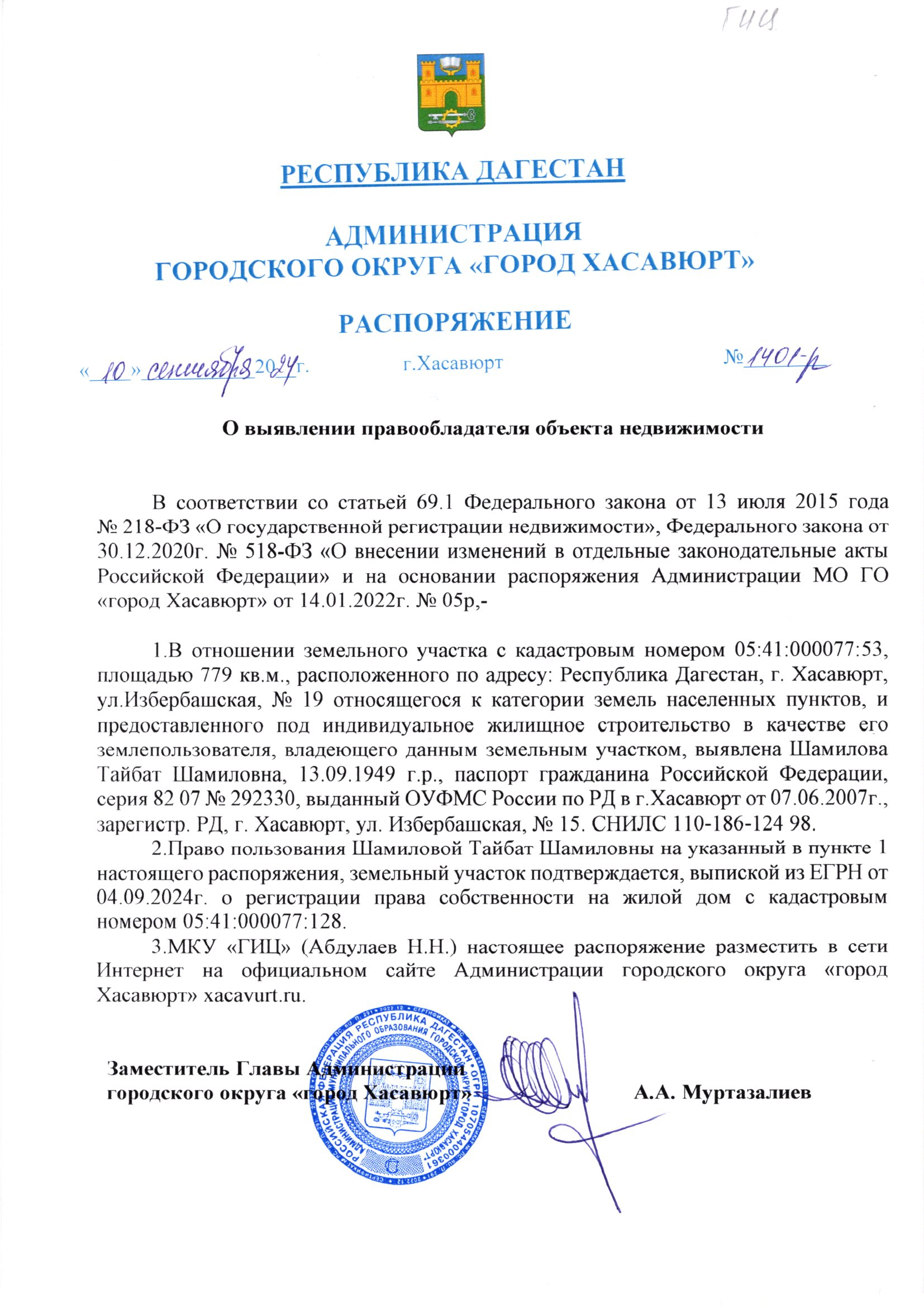 Распоряжение от 10 сентября 2024 г. № 1401-р О выявлении правообладателя объекта недвижимости