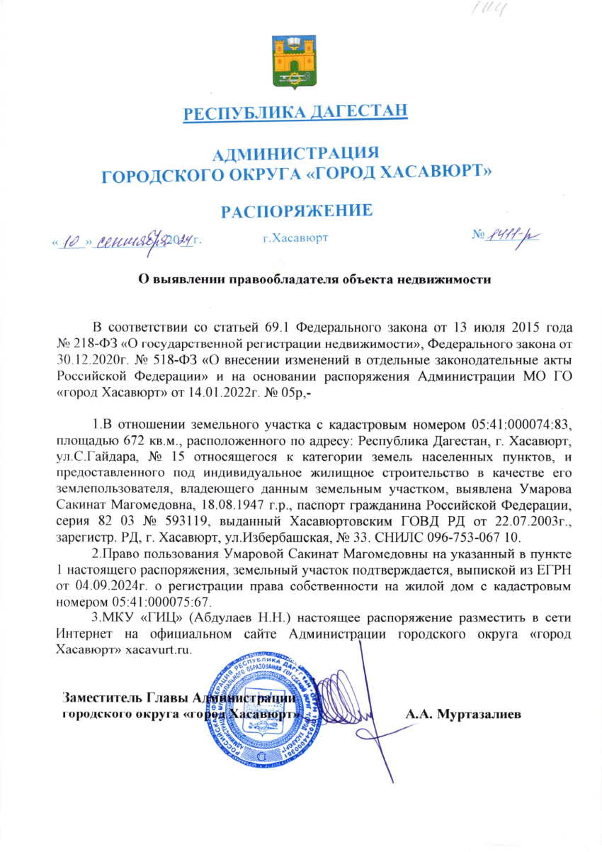 Распоряжение от 05 сентября 2024 г. № 1374-р О выявлении правообладателя объекта недвижимости