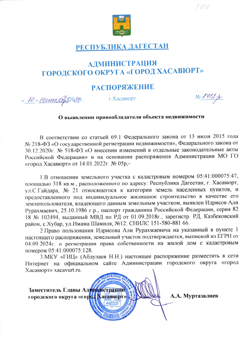 Распоряжение от 10 сентября 2024 г. № 1412-р О выявлении правообладателя объекта недвижимости