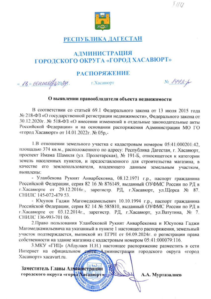 Распоряжение от 18 сентября 2024 г. № 1442-р О выявлении правообладателя объекта недвижимости