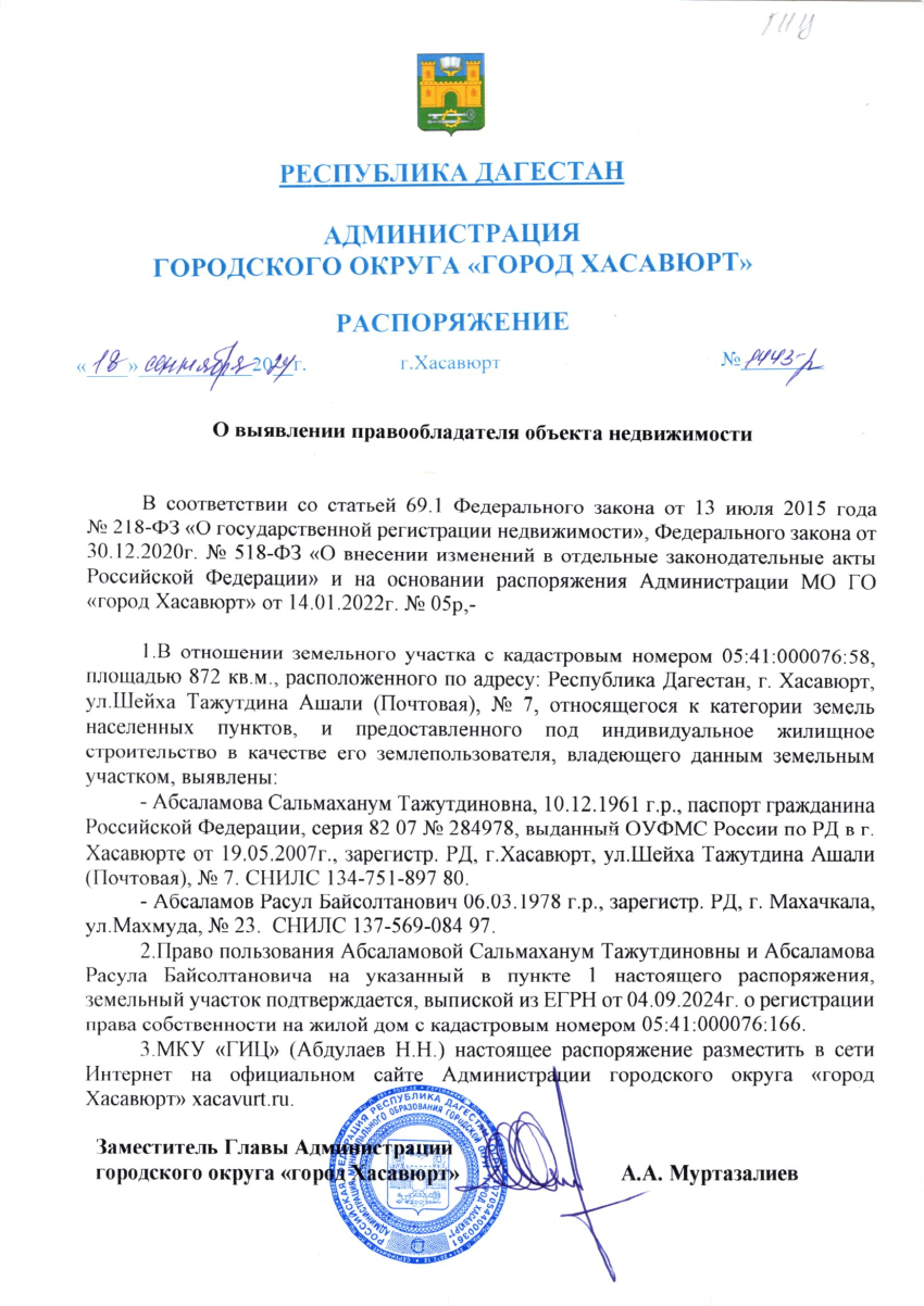 Распоряжение от 18 сентября 2024 г. № 1443-р О выявлении правообладателя объекта недвижимости