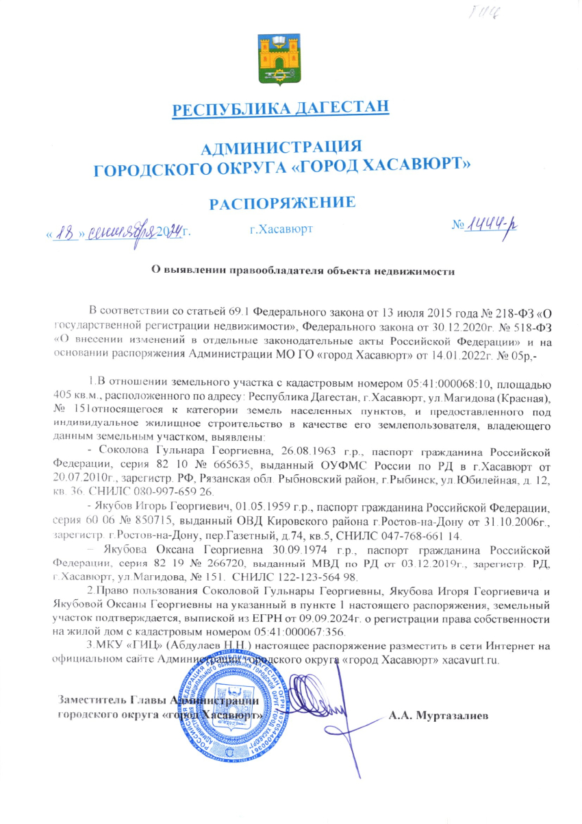 Распоряжение от 18 сентября 2024 г. № 1444-р О выявлении правообладателя объекта недвижимости