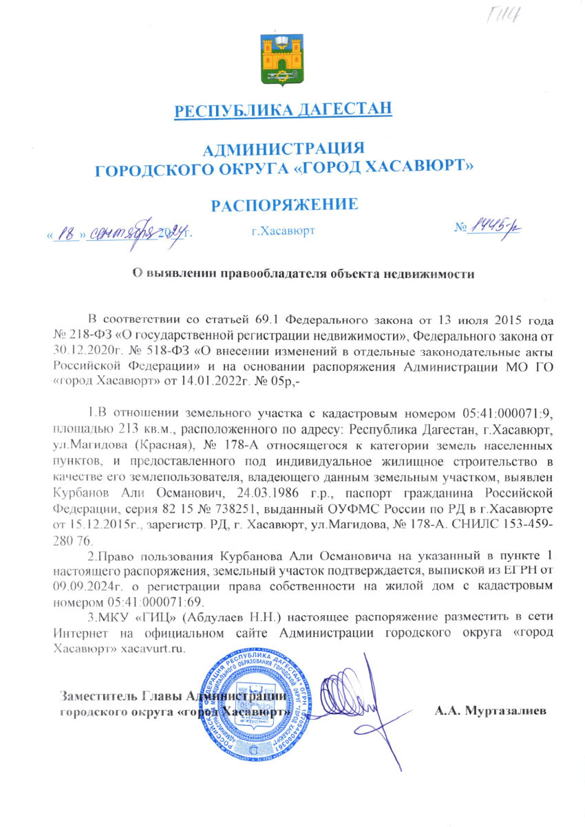 Распоряжение от 18 сентября 2024 г. № 1445-р О выявлении правообладателя объекта недвижимости