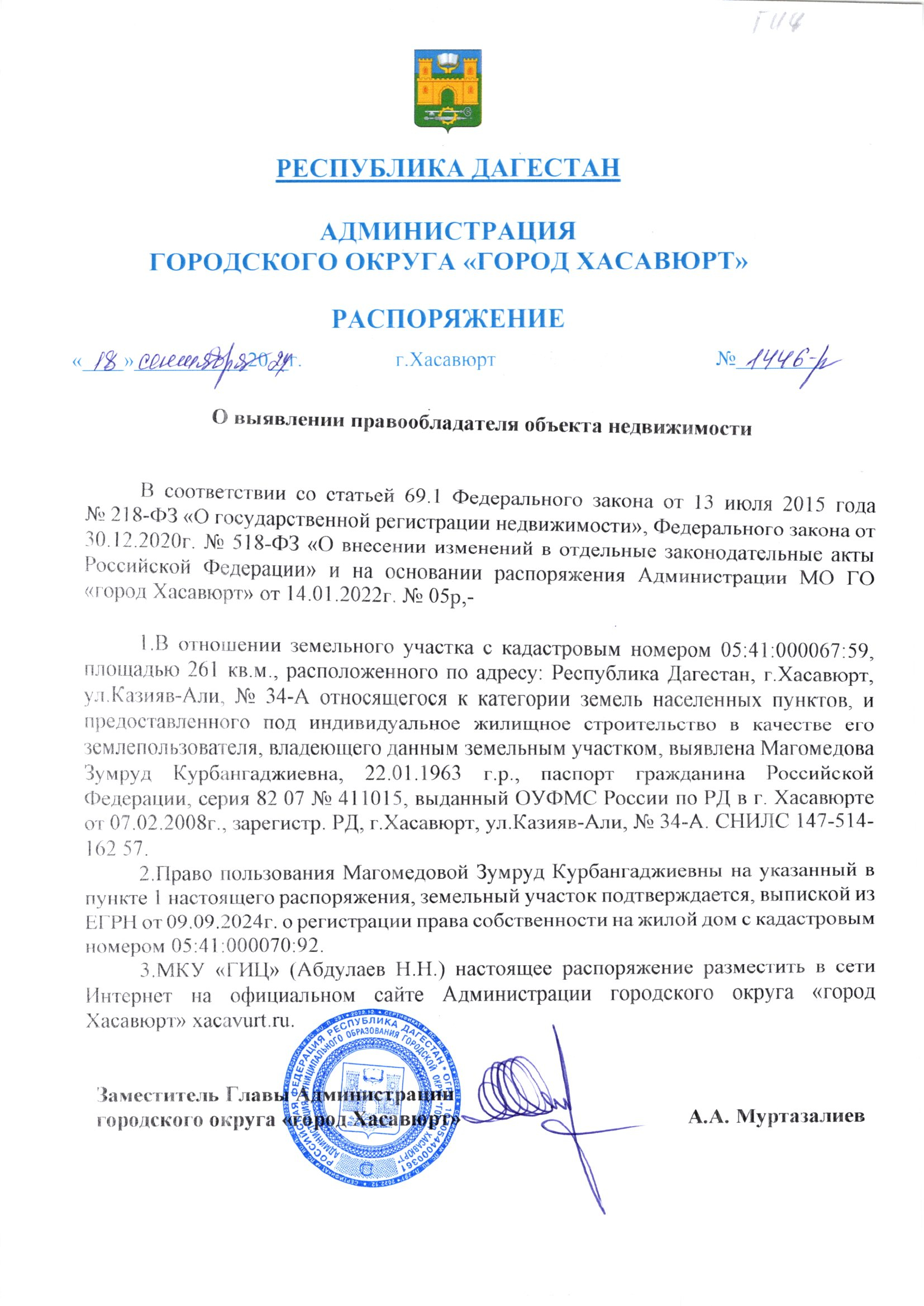 Распоряжение от 18 сентября 2024 г. № 1446-р О выявлении правообладателя объекта недвижимости