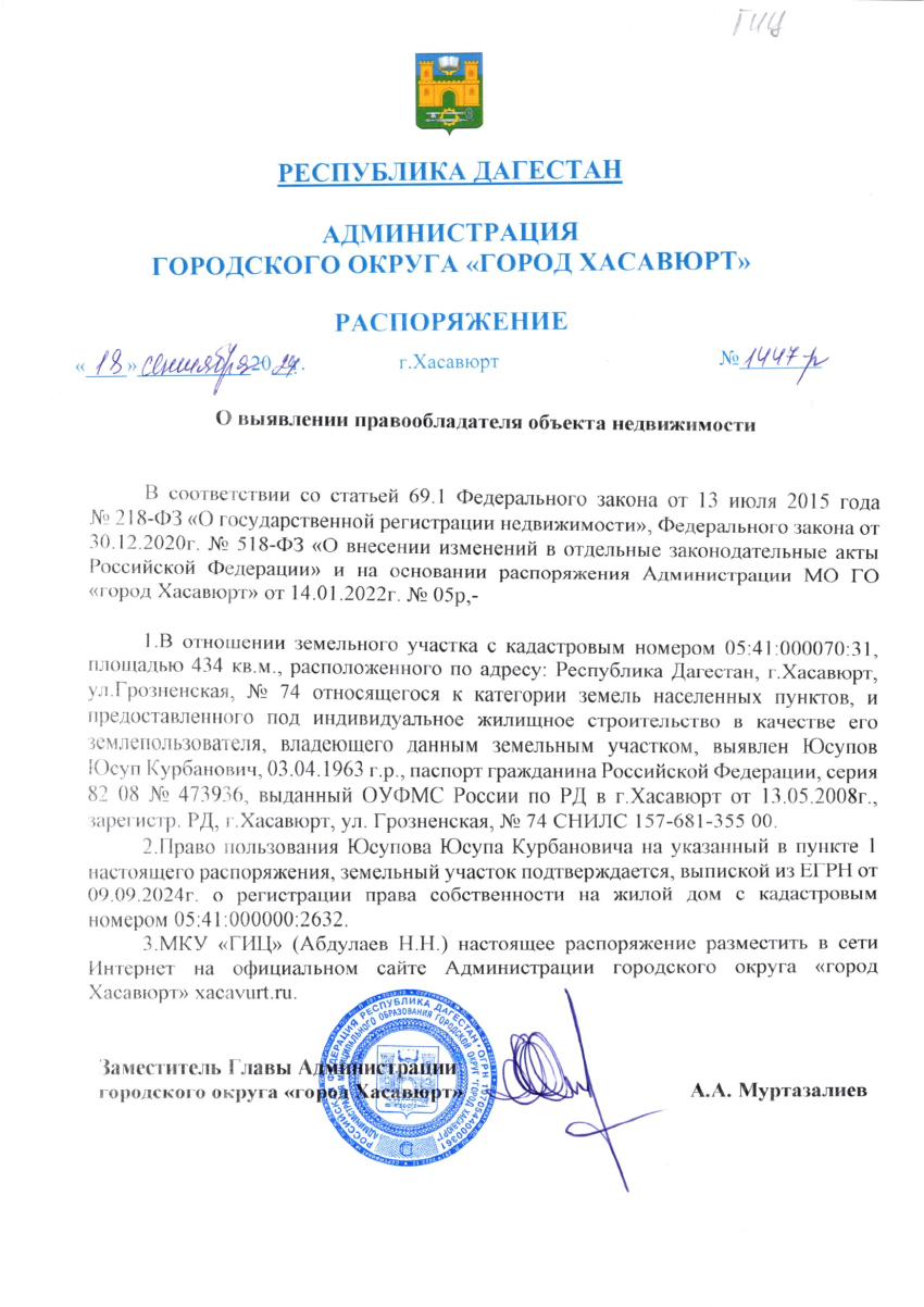 Распоряжение от 18 сентября 2024 г. № 1447-р О выявлении правообладателя объекта недвижимости