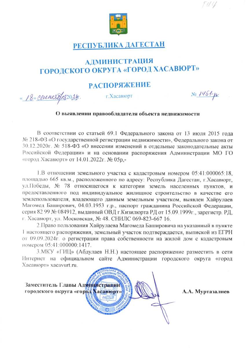 Распоряжение от 18 сентября 2024 г. № 1451-р О выявлении правообладателя объекта недвижимости