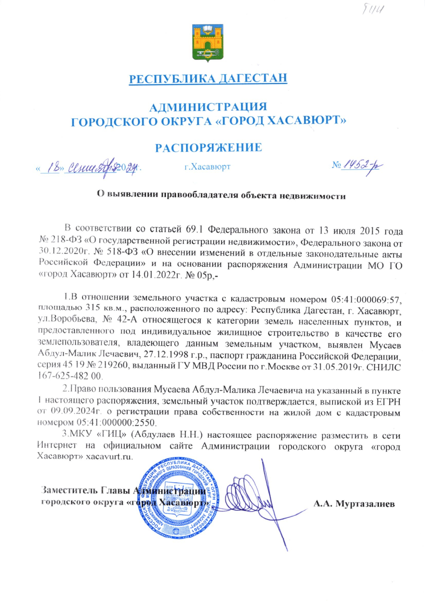 Распоряжение от 18 сентября 2024 г. № 1452-р О выявлении правообладателя объекта недвижимости