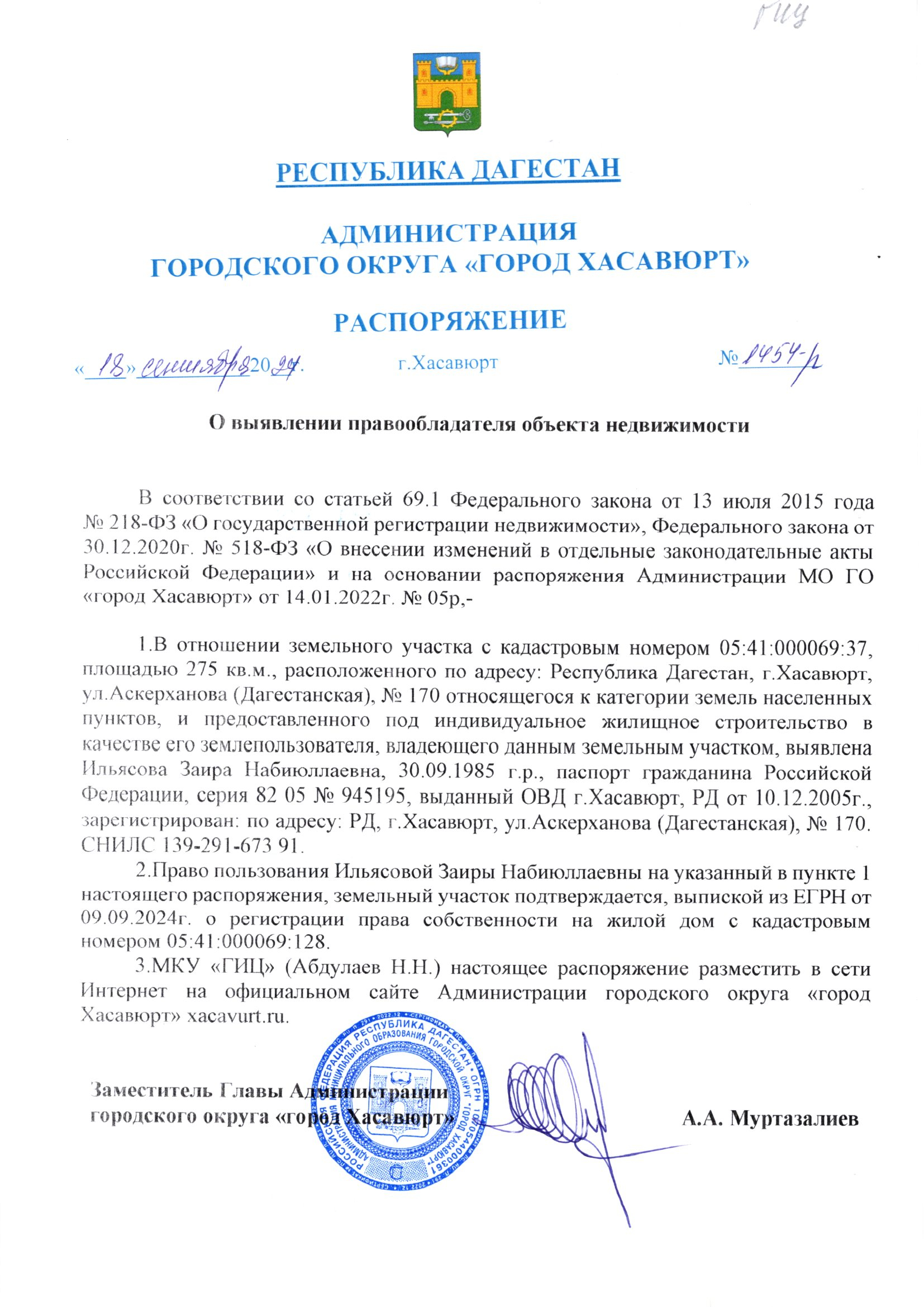 Распоряжение от 18 сентября 2024 г. № 1454-р О выявлении правообладателя объекта недвижимости