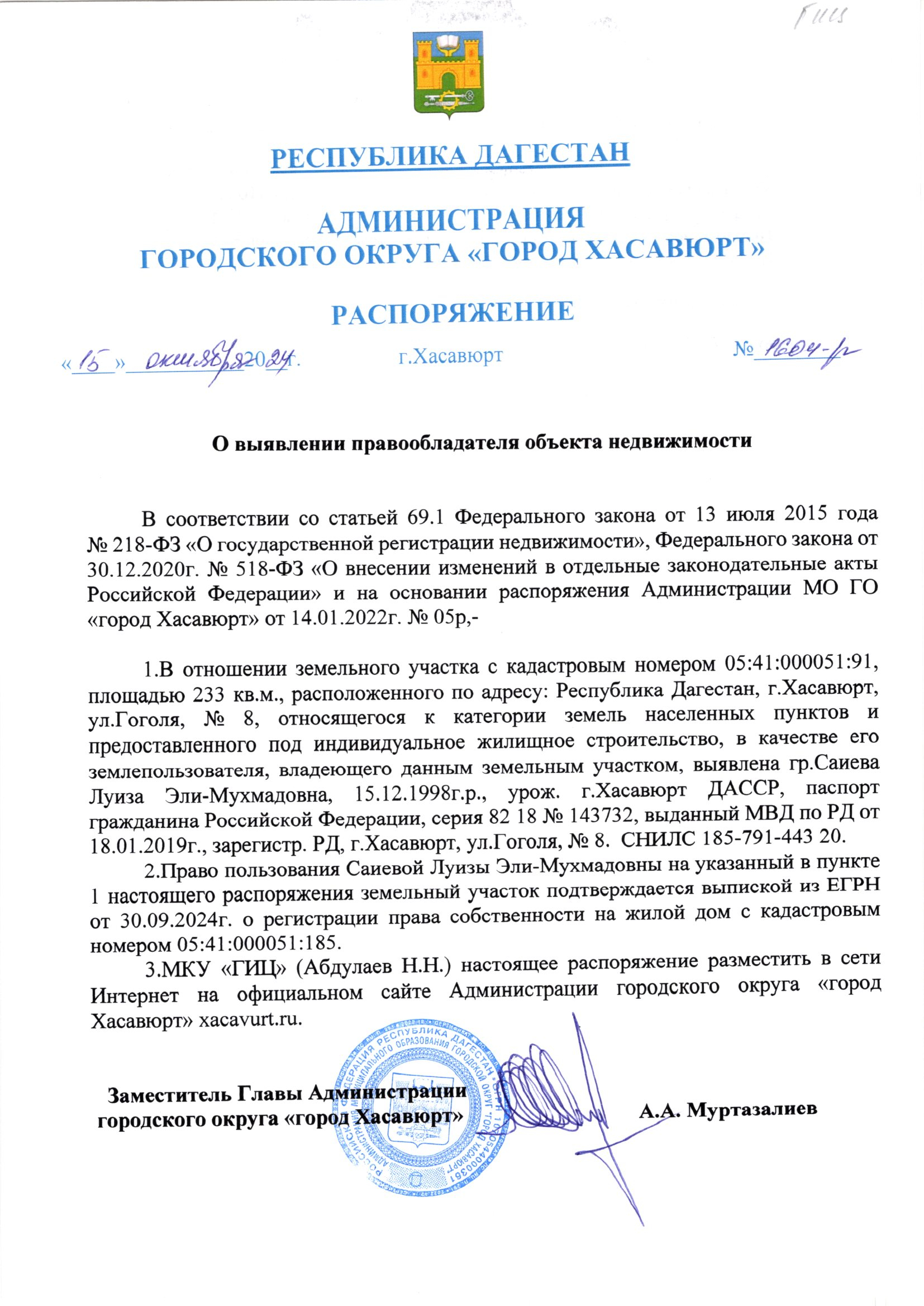 Распоряжение от 15 октября 2024 г. № 1604-р О выявлении правообладателя объекта недвижимости