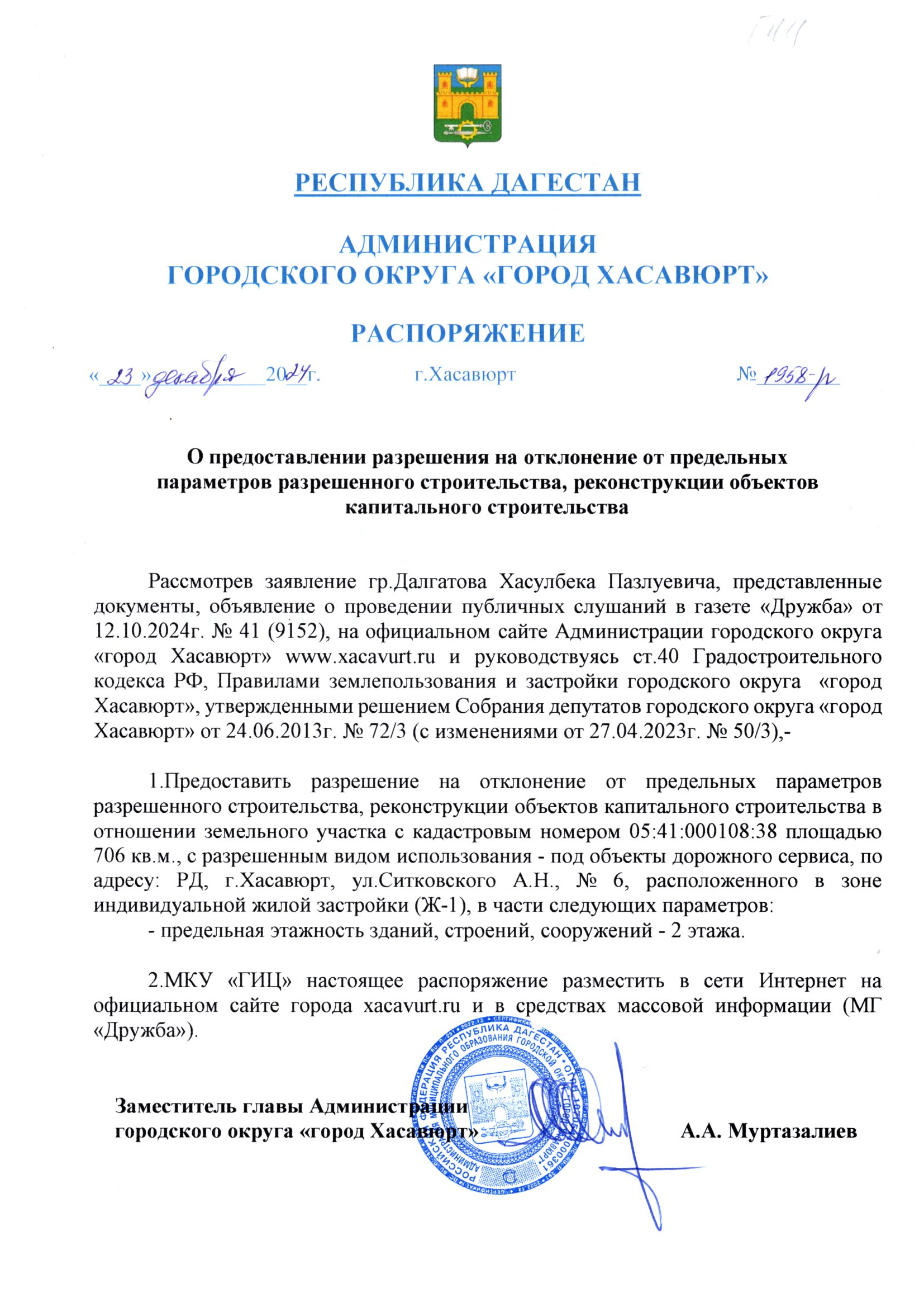 Распоряжение от 23 декабря 2024 г. № 1958-р О предоставлении разрешения на отклонение от предельных параметров разрешенного строительства, реконструкции объектов капитального строительства