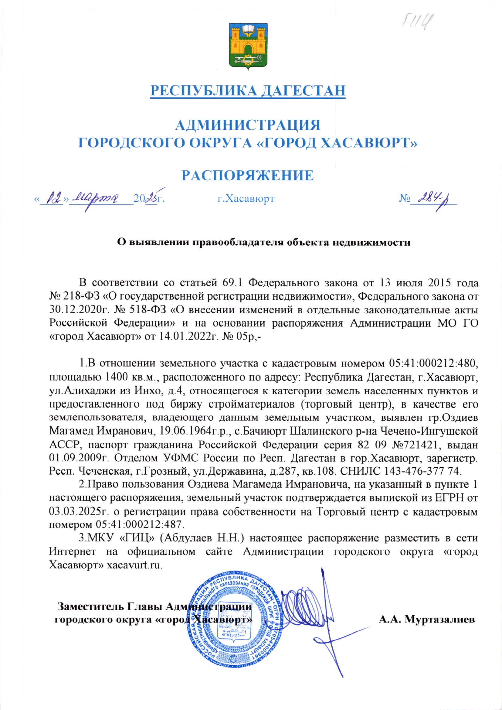 Распоряжение от 12 марта 2025 г. № 284-р О выявлении правообладателя объекта недвижимости