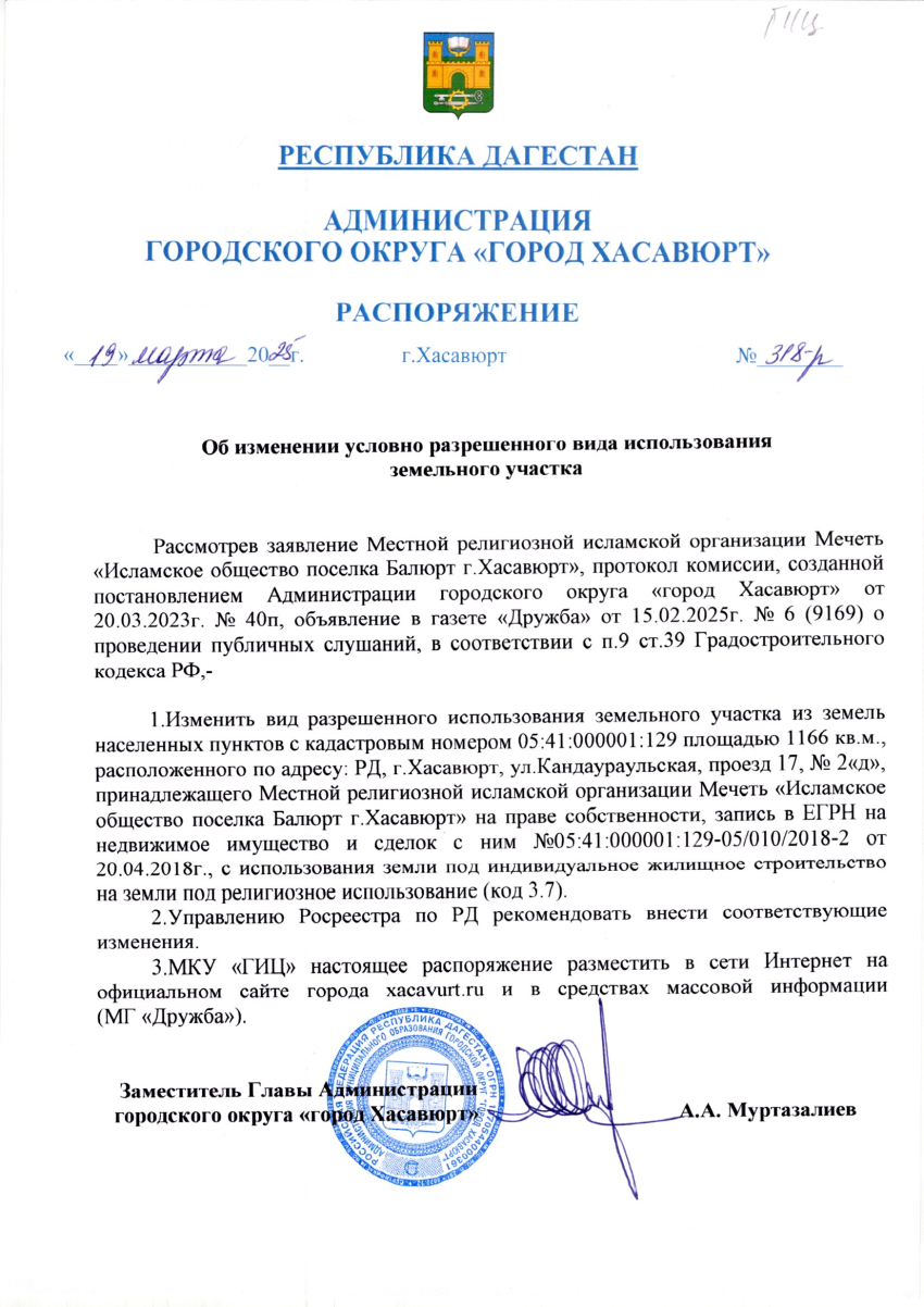 Распоряжение от 19 марта 2025 г. № 318-р Об изменении разрешенного вида использования земельного участка