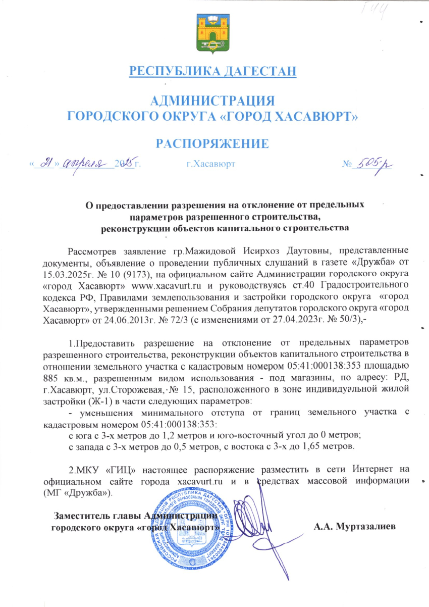 Распоряжение от 21 апреля 2025 г. № 505-р О предоставлении разрешения на отклонение от предельных параметров разрешенного строительства, реконструкции объектов капитального строительства