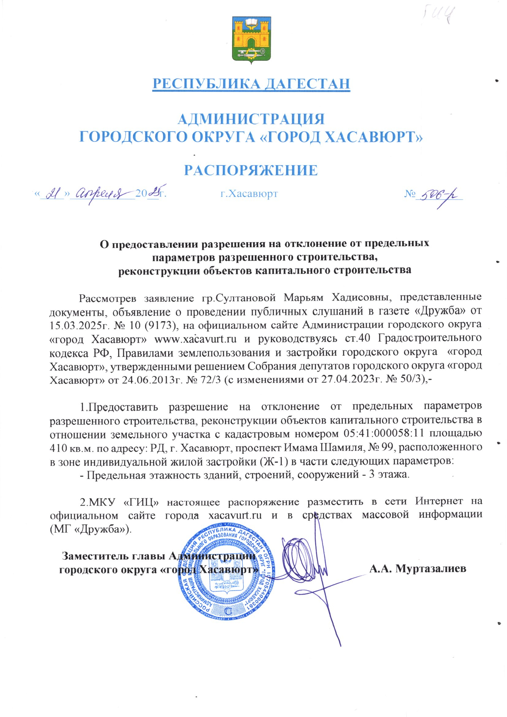 Распоряжение от 21 апреля 2025 г. № 505-р О предоставлении разрешения на отклонение от предельных параметров разрешенного строительства, реконструкции объектов капитального строительства