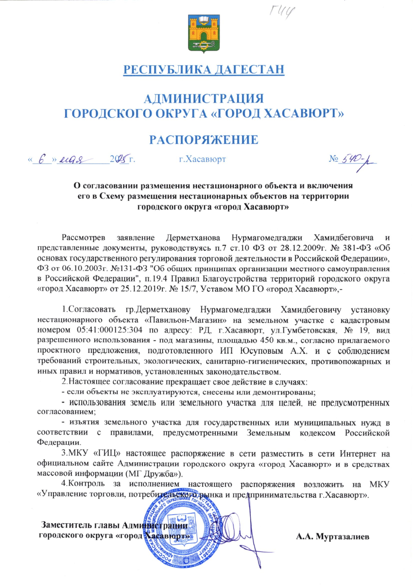 Распоряжение от 6 мая 2025 г. № 540-р О согласовании размещения нестационарного объекта и включения его в Схему размещения нестационарных объектов на территории городского округа "город Хасавюрт"