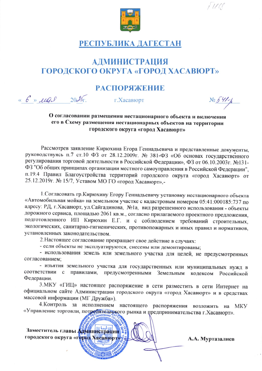 Распоряжение от 6 мая 2025 г. № 541-р О согласовании размещения нестационарного объекта и включения его в Схему размещения нестационарных объектов на территории городского округа "город Хасавюрт"
