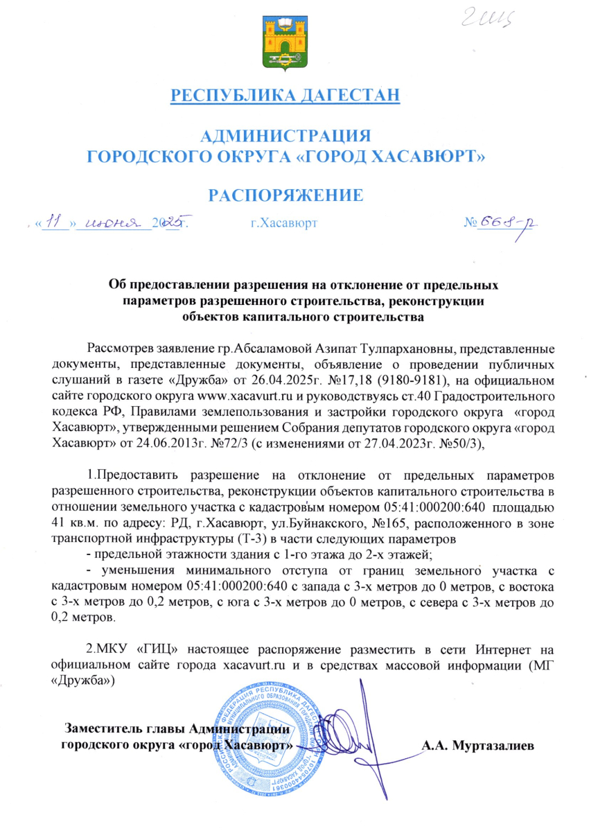 Распоряжение от 11 июня 2025 г. № 668-р Об предоставлении разрешения на отклонение от предельных параметров разрешенного строительства, реконструкции объектов капитального строительства