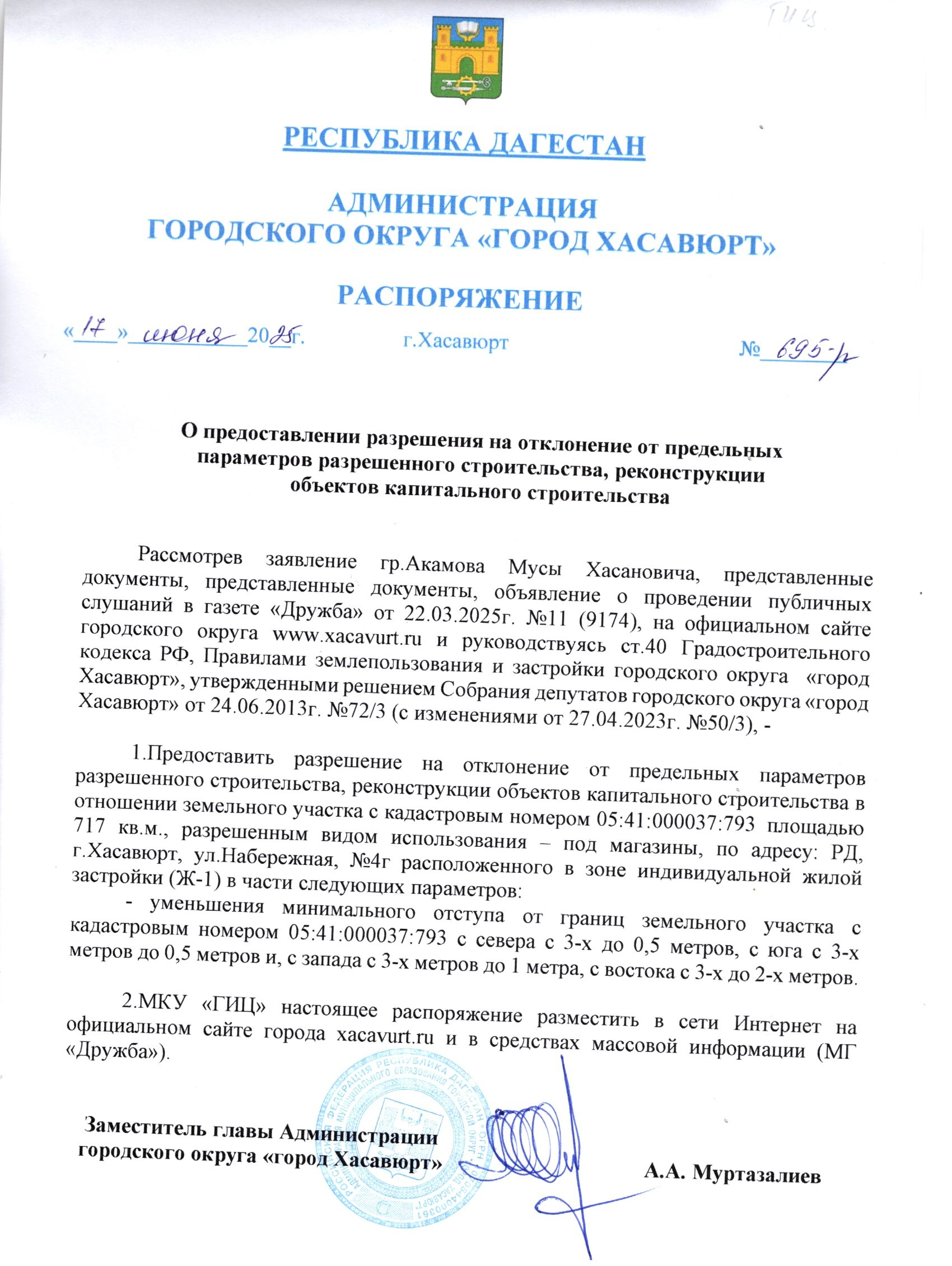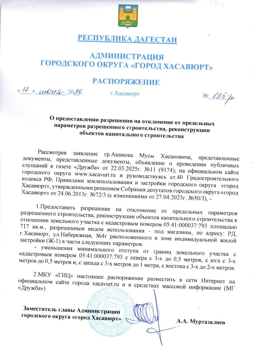 Распоряжение от 17 июня 2025г. № 695-р О предоставлении разрешения на отклонение от предельных параметров разрешенного строительства, реконструкции объектов капитального строительства