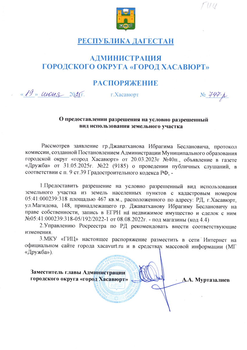 Распоряжение от 19 июня 2025г. № 747-р О предоставлении разрешения на условно разрешенный вид использования земельного участка