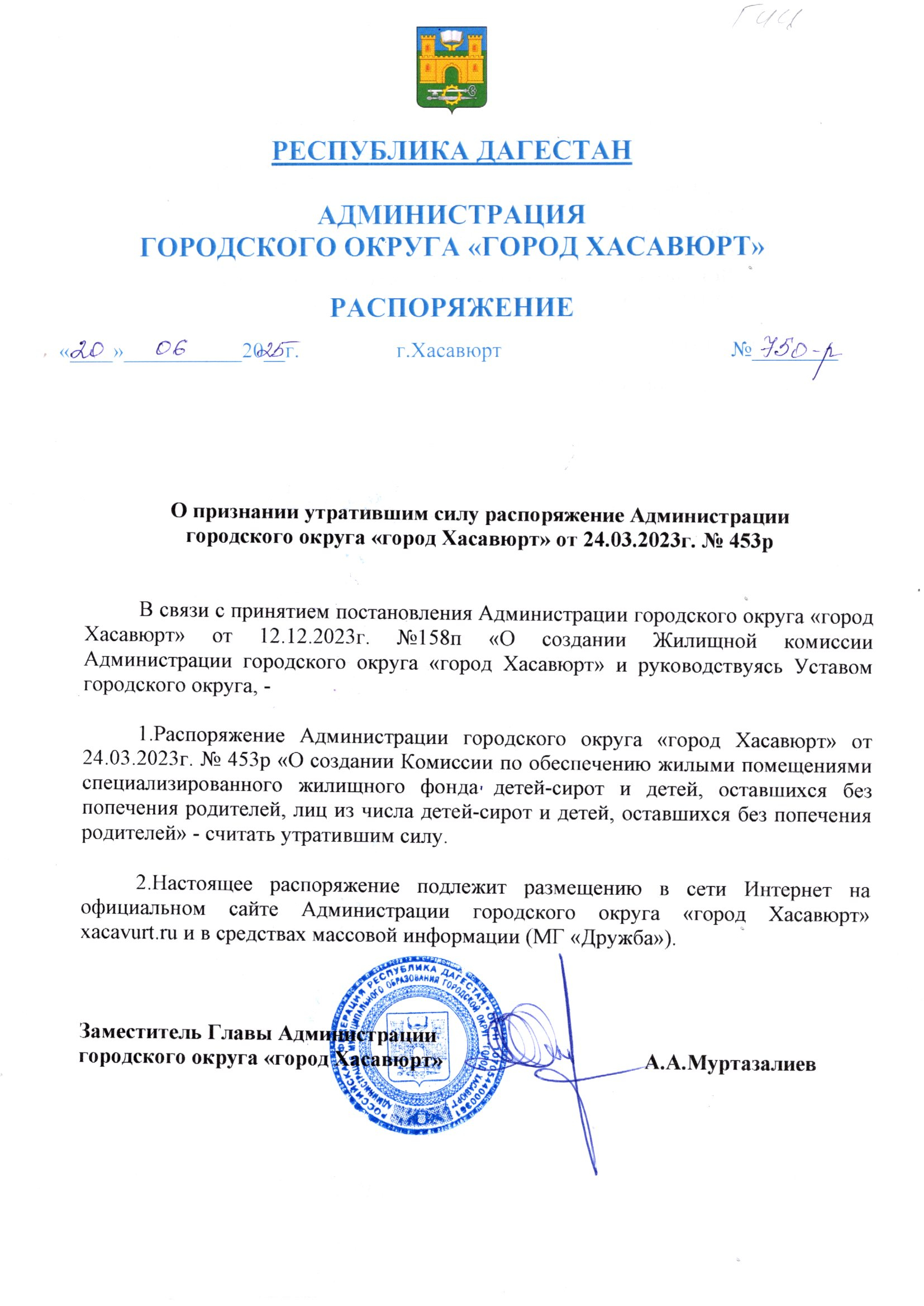 Распоряжение от 20.06.2025г. №750-р О признании утратившим силу распоряжение Администрации городского округа «город Хасавюрт» от 24.03.2023 г. № 453р