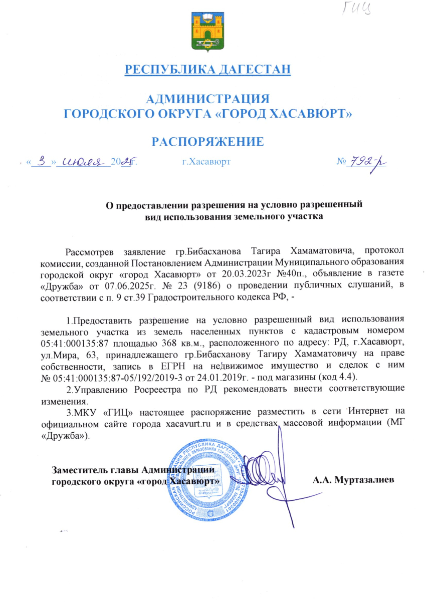 Распоряжение от 3 июля 2025 г. № 792-р О предоставлении разрешения на условно разрешенный вид использования земельного участка