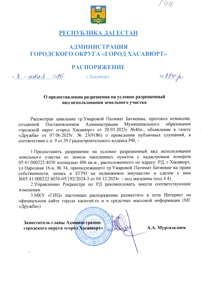 Распоряжение от 7 июля 2025 г. № 794-р О предоставлении разрешения на условно разрешенный вид использования земельного участка