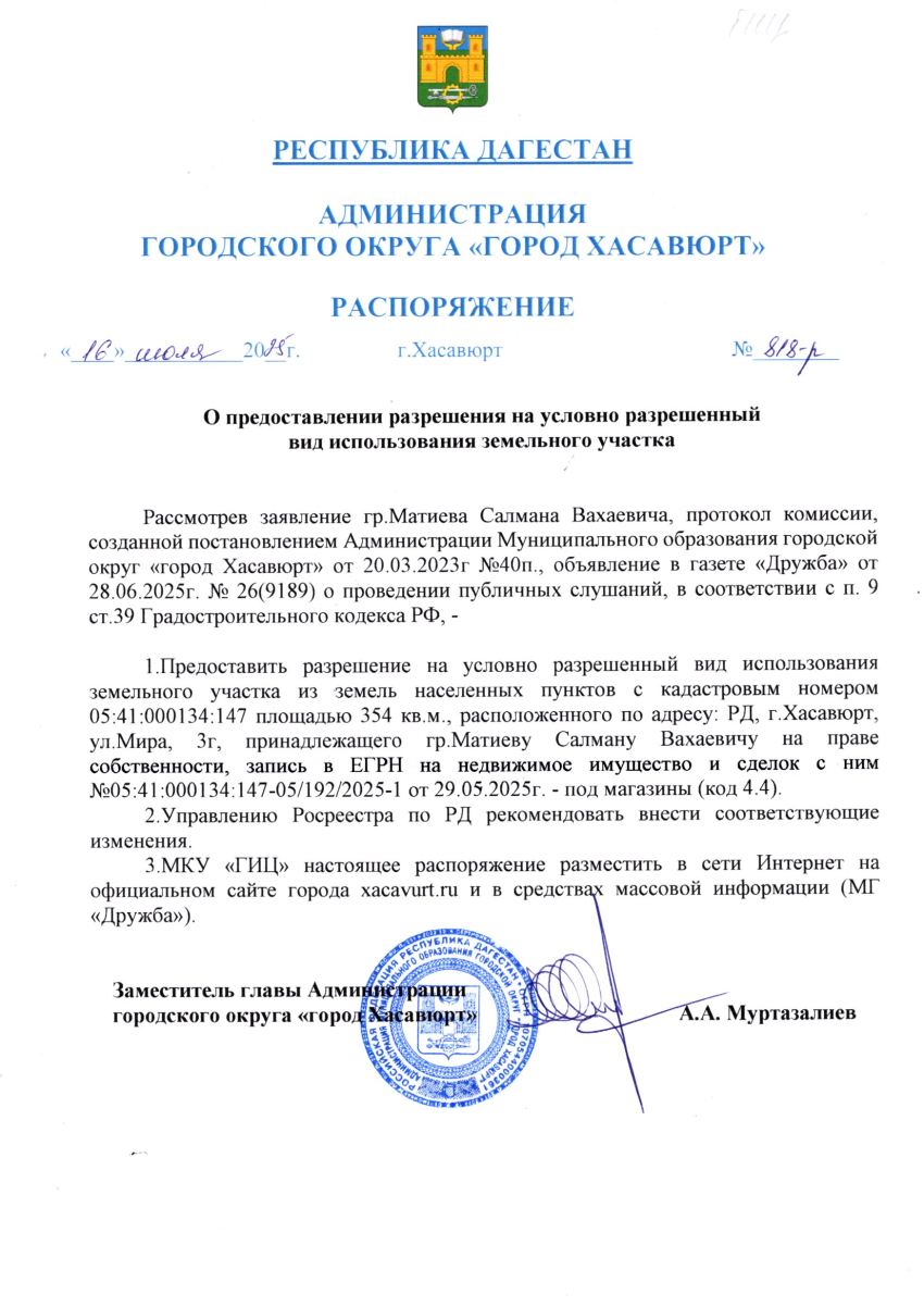 Распоряжение от 16 июля 2025 г. № 818-р О предоставлении разрешения на условно разрешенный вид использования земельного участка
