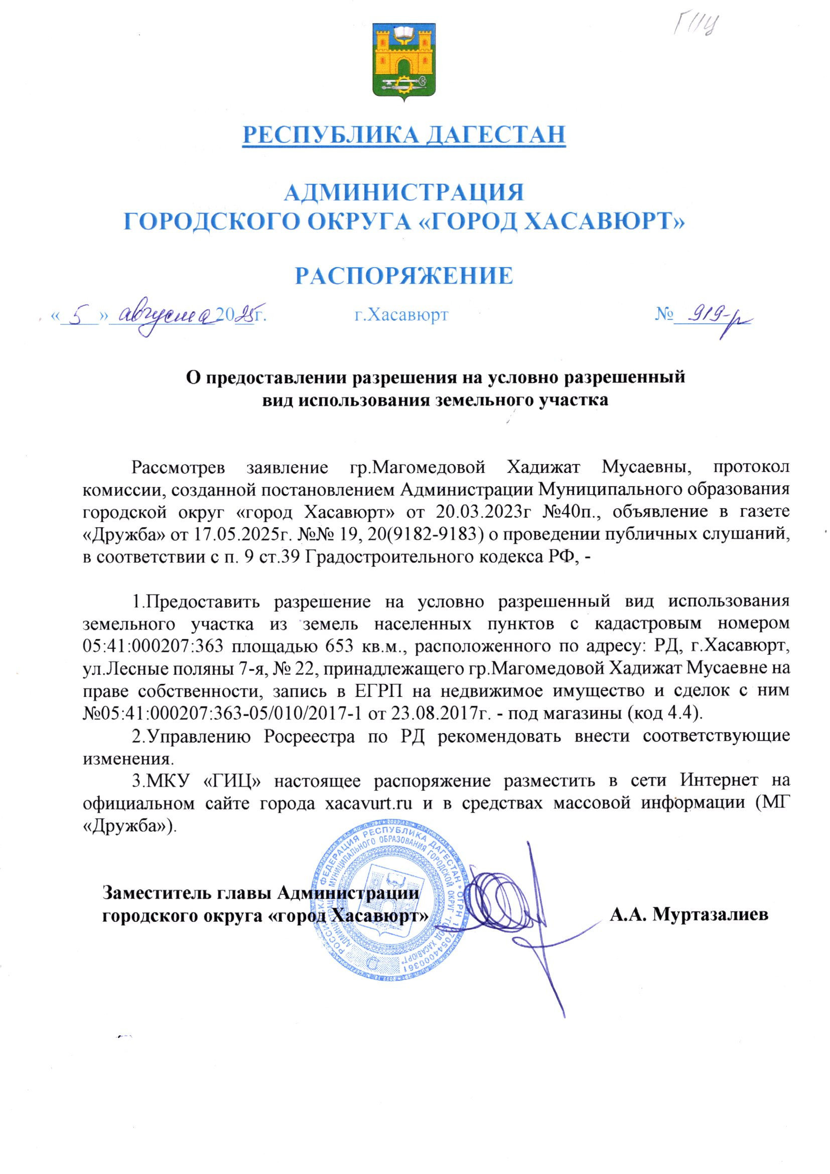 Распоряжение от 5 августа 2025 г. № 919-р О предоставлении разрешения на условно разрешенный вид использования земельного участка