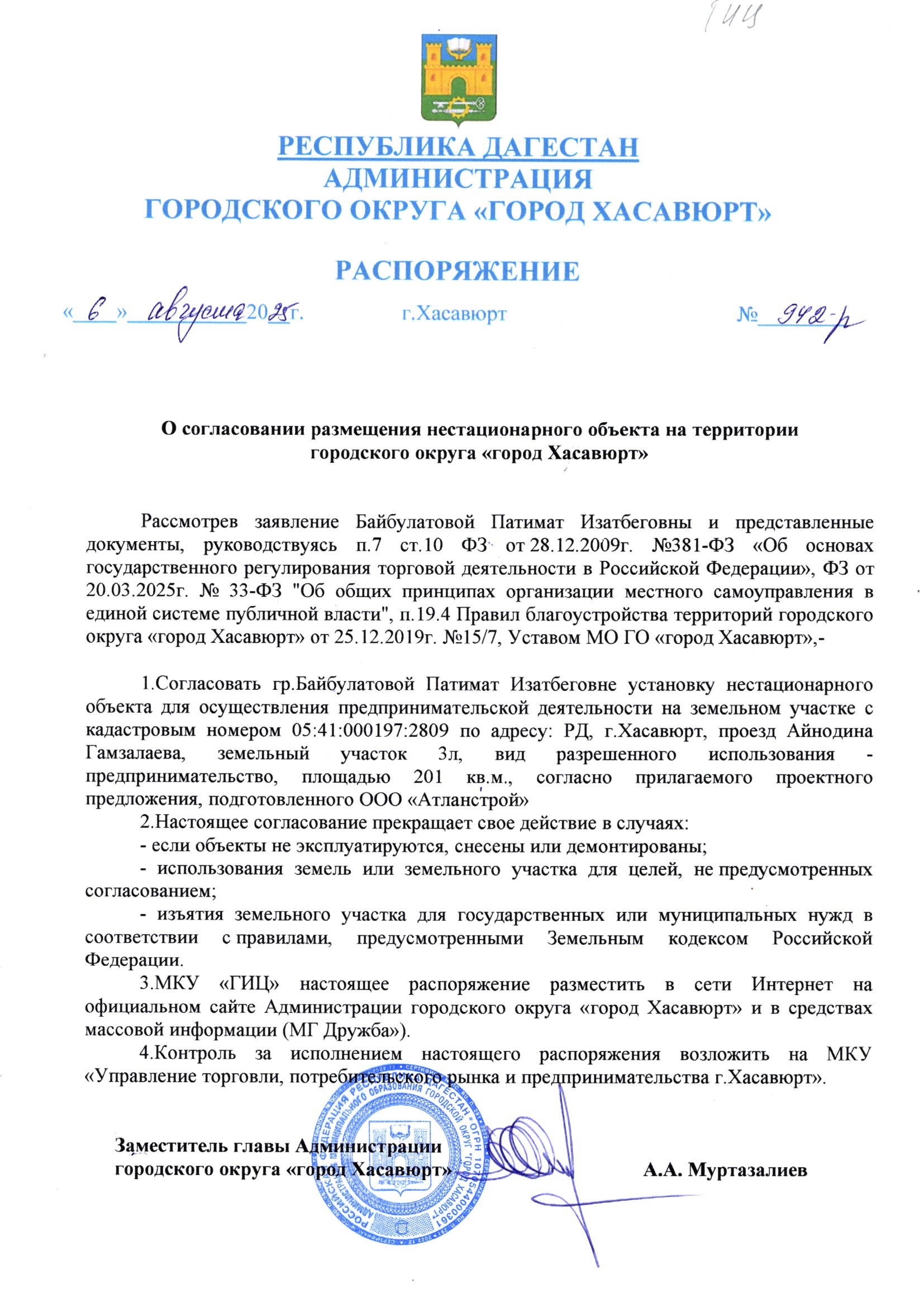 Распоряжение от 6 августа 2025 г. № 942-р О согласовании размещения нестационарного объекта на территории городского округа "город Хасавюрт"