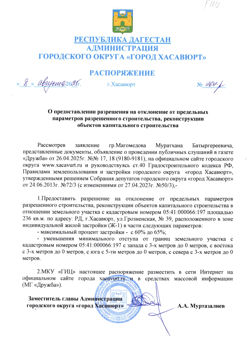 Распоряжение от 8 августа 2025 г. № 964-р О предоставлении разрешения на отклонение от предельных параметров разрешенного строительства, реконструкции объектов капитального строительства