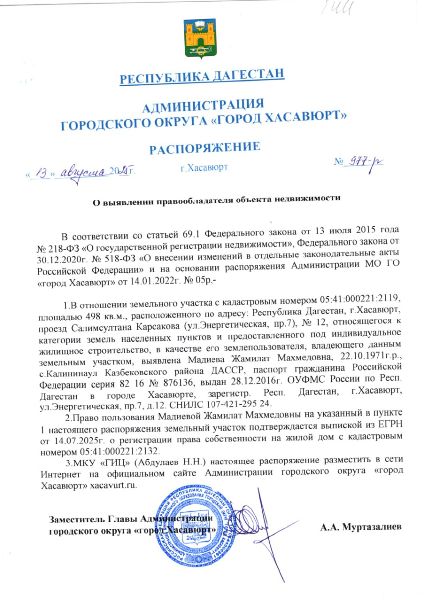 Распоряжение от 13 августа 2025 г. № 977-р О выявлении правообладателя объекта недвижимости