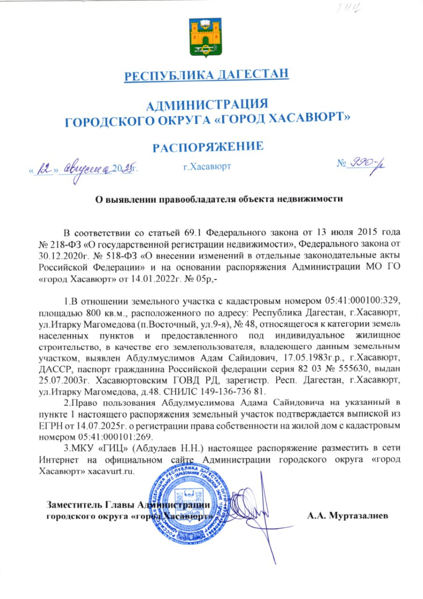 Распоряжение от 13 августа 2025 г. № 977-р О выявлении правообладателя объекта недвижимости